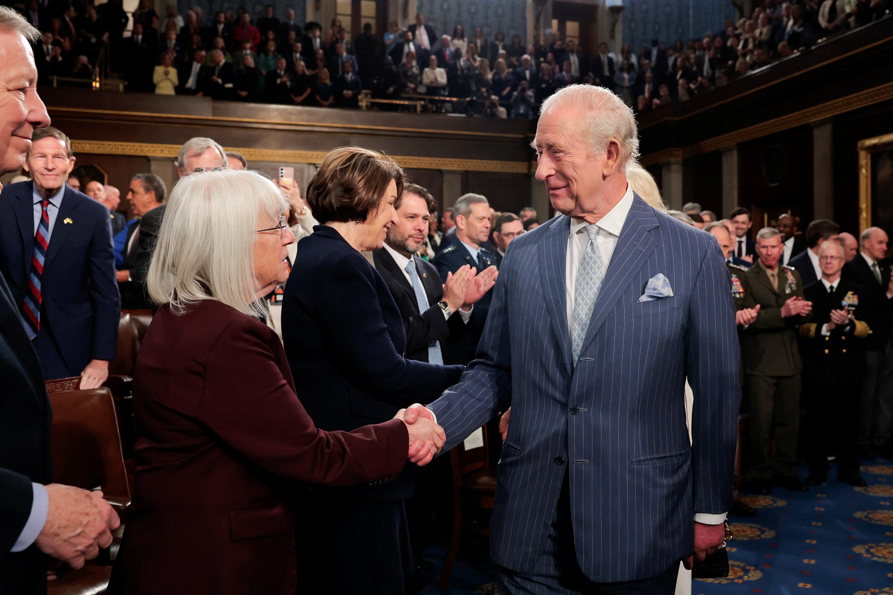 Britain’s King Charles shakes hands with Sen. Patty Murray as he leaves after his address to a joint meeting of Congress in the House Chamber of the U.S. Capitol in Washington, April 28, 2026.