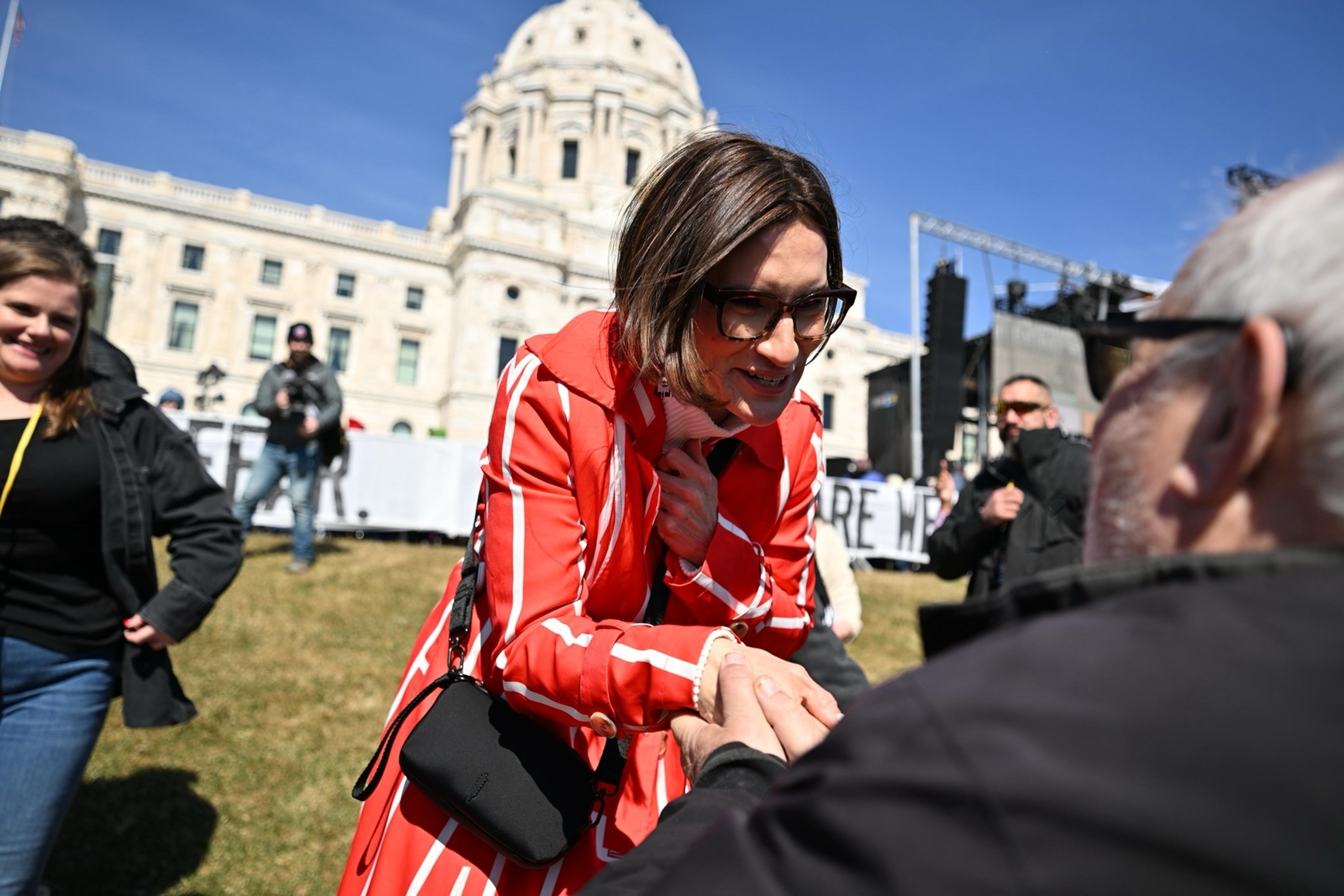 Minn. Lt Gov Peggy Flanagan greets people at the “No Kings” protest, March 28, 2026, in St. Paul, Minn.