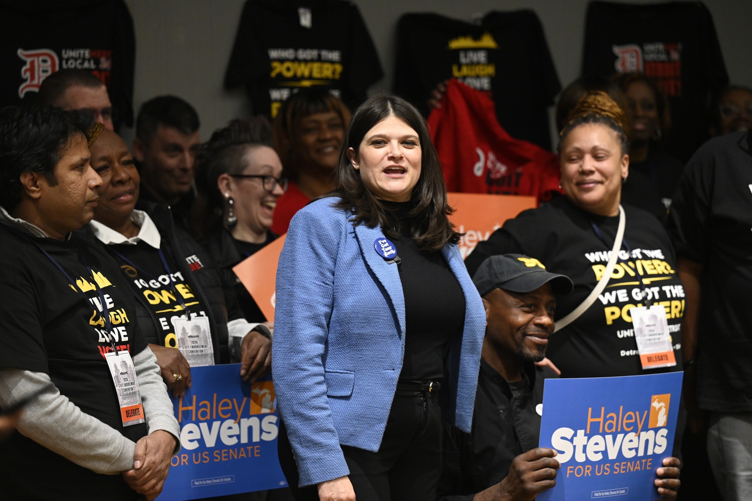 Rep. Haley Stevens, a candidate for the U.S. Senate, stands with supporters before a press conference at the Michigan Democratic Party State Endorsement Convention, April 19, 2026, in Detroit.
