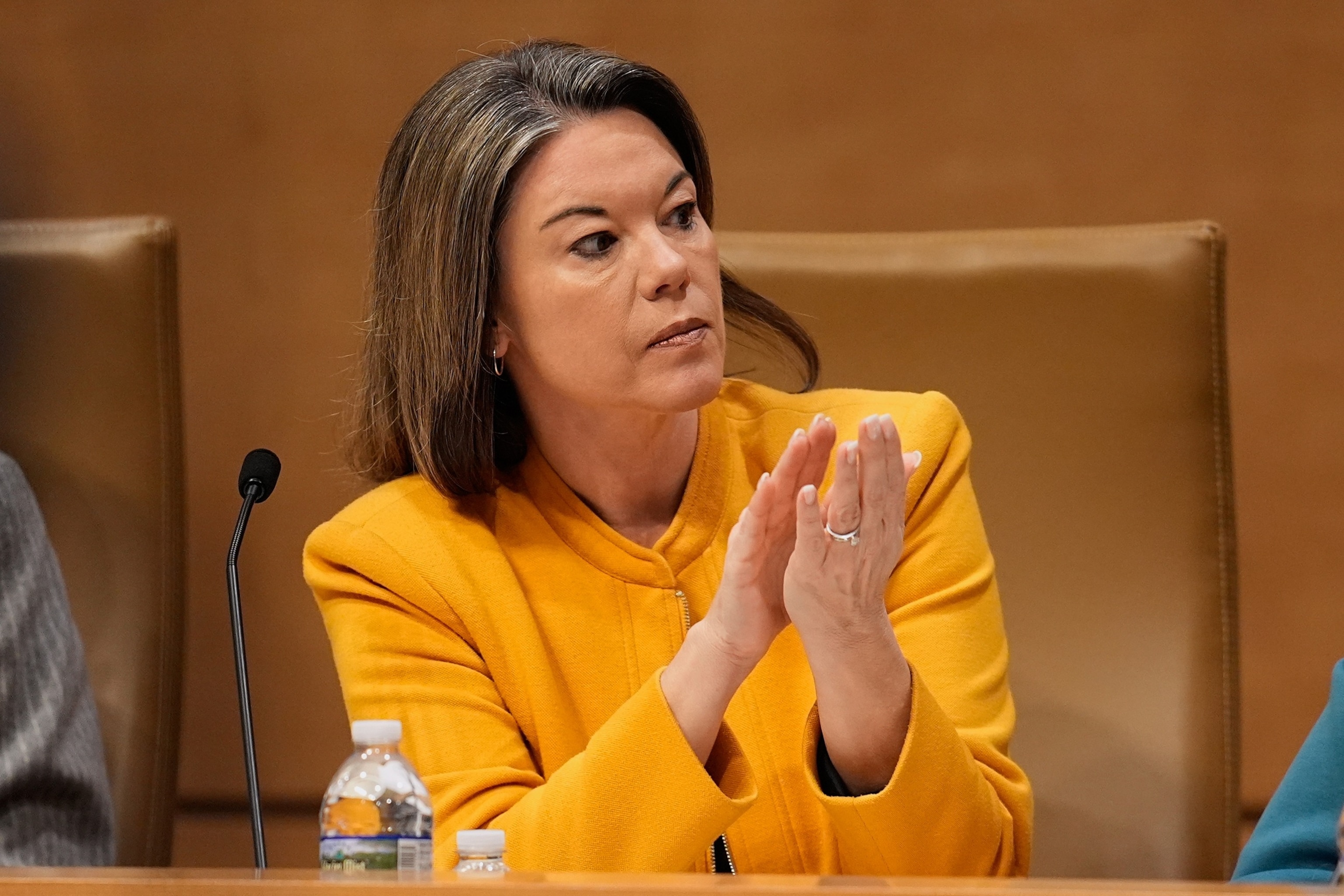 Rep. Angie Craig claps during a field hearing on immigration, Jan. 16, 2026, in St. Paul, Minn.